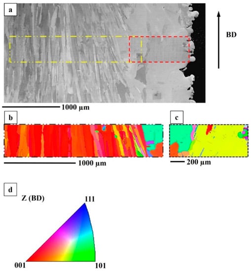 An HIP+STA specimen. (a) BSE image including both contour and hatch region; (b) EBSD IPF map of hatch region indicated in (a). (c) EBSD IPF map of contour region indicated in (a). (d) IPF map legend to interpret (b,c).