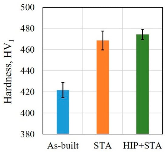 The hardness measurements acquired from different locations of the as-built (bottom, middle and top region) and the two post-treated specimens (end 1, end 2 and middle) did not show a significant variation along the build direction. Therefore, the hardness measurements obtained from different locations of these specimens are grouped together and reported (see Figure 11). The HIP+STA and the STA specimens had higher hardness compared to the as-built specimens. The HIP+STA specimens, on average, had a slightly higher hardness compared to the STA specimens.
