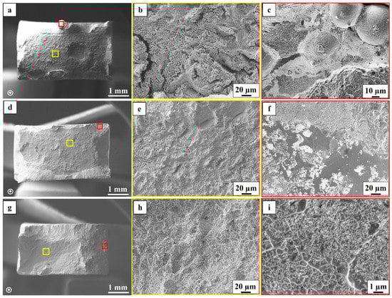 SE images of tensile fracture surfaces of (a–c) the as-built condition; (d–f) the STA condition and (g–i) the HIP+STA condition. (b,e) Shrinkage porosities; (e,f) LoF defect area. (i) The partially healed LoF area.