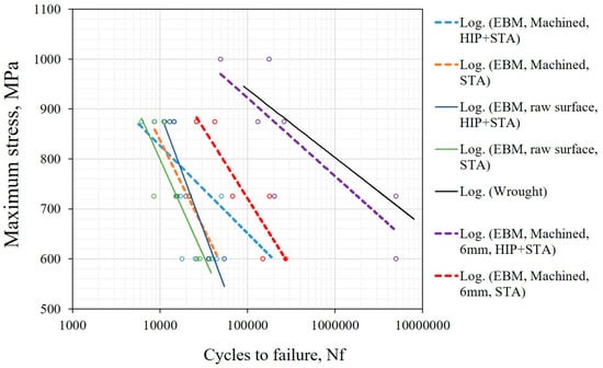 The complete removal of the contour region by machining (for specimens with 6 × 6 cross section) improved fatigue life significantly. In the STA condition, removing the contour region improved fatigue life by approximately an order of magnitude compared to the specimens with contour, whereas in the HIP+STA condition the improvement in fatigue life is roughly two orders of magnitude. In the STA condition, shrinkage porosities are present in the crack propagation region, as seen in Figure 15. These defects were not present in the fracture surfaces of HIP+STA treated specimens. Two specimens in the HIP+STA condition, one each tested at 600 MPa and 725 MPa, sustained 5 million cycles and did not fracture. One of the specimens tested at 725 MPa failed at a relatively lower life and had fatigue crack initiation from a LoF defect on the side surface of the specimen (adjacent side to the loading side). This LoF defect had not healed because of the presence of oxides and it was not removed by machining.