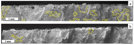 All specimens in the HIP+STA condition with the contour region (the ‘raw’ as-built specimens and machined specimens with 10 × 10 cross-section) had a faceted appearance on the fracture surface, whereas the specimens without the contour region (machined specimens with 6 × 6 cross-section) did not show a faceted appearance, as seen in Figure 16a–c. The STA specimens did not show any such faceting behaviour (see Figure 14).