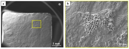 SEM images of the fatigue fracture surface of a 6 × 6 specimen in the STA condition; (a) overview, (b) shrinkage porosities in the crack propagation area.
