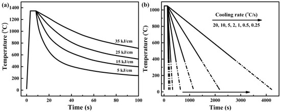 The simulated welding thermal cycles with different (a) heat inputs, and (b) cooling rates.