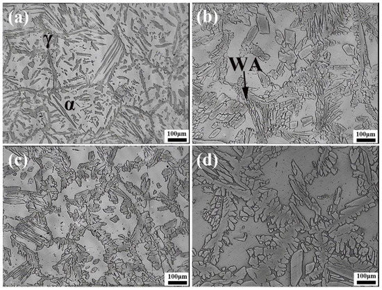 Microstructure of specimens with different heat inputs: (a) 5 kJ/cm; (b) 15 kJ/cm; (c) 25 kJ/cm; (d) 35 kJ/cm. α stands for the ferrite phase and γ represents the austenite phase. WA means the Widmanstatten-type austenite.