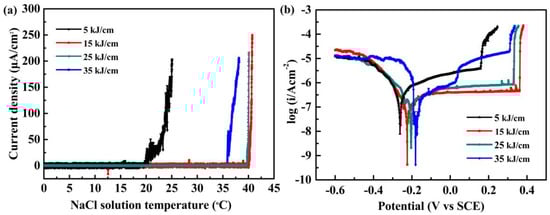(a) The current density plots under 250 mVSCE in 1 M NaCl solution in the critical pitting temperature (CPT) test; (b) the potentiodynamic polarization curves in 3.5 wt.% NaCl solution.