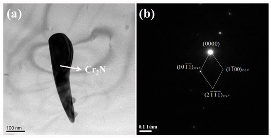 TEM characterization of Cr2N in the DSS 2002 specimen with a heat input of 5 kJ/cm: (a) a bright-field image; (b) diffraction pattern.