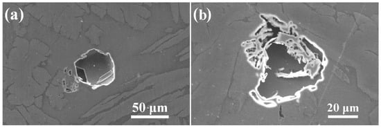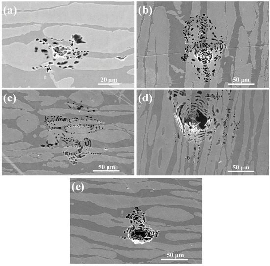 The SEM morphologies of the LDSS 2002 specimens with different cooling rates after the CPT tests are depicted in Figure 9. All the stable pits present the lace-like topography. According to the literature [45,46], the lace-like morphology illustrates that the hindered diffusion is essential for the formation of stable pits in the early stage of pitting development. As seen in Figure 9, the stable lace-like pits can be found along the ferrite/austenite phase boundaries and preferentially extend into the ferrite phase. If the pits continue to develop, they appear to grow into the austenite phase. This illustrates that the harmful secondary phases of M23C6 and Cr2N may precipitate along the ferrite/austenite boundary during the LTHAZ cooling process, leading to the formation of a Cr-depleted zone. Furthermore, the element Cr in the ferrite phase diffused into the ferrite/austenite boundary, which resulted in the expansion of pits into the interior of the ferrite phase that lacked Cr [47].