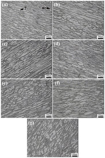 Microstructure of specimens with different cooling rates: (a) 0.25 °C/s; (b) 0.5 °C/s; (c) 1 °C/s; (d) 2 °C/s; (e) 5 °C/s; (f) 10 °C/s; (g) 20 °C/s.