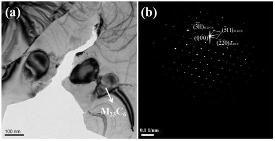 TEM Characterization of M23C6 phase in the DSS 2002 specimen with a cooling rate of 0.25 °C/s: (a) a bright-field image; (b) diffraction pattern.