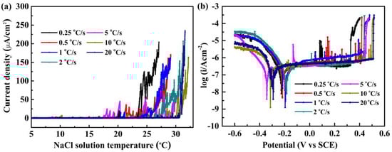 (a) The current density curve in the CPT tests under 250 mVSCE; (b) the potentiodynamic polarization curves in the 3.5 wt.% NaCl solution for the 2002 specimens with different cooling rates.