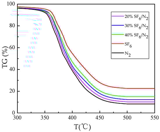 As the reaction gas, thermal conductivity of SF6 is lower than that of N2, therefore, the poor thermal conductivity of SF6 is not conducive to the decomposition of epoxy resin. However, N2 has higher thermal stability due to its large molecular bond energy of 946 kJ/mol. So N2 will not decompose or react with epoxy resin in the experimental temperature range. In pure SF6, SF6 begins to decompose at about 260 °C, and reaction between SF6 and epoxy resin would help add to the whole weight of the residue. The decrease of SF6 content in gas mixture will reduce the thermal stability of the system, making epoxy resin easier to react with SF6.