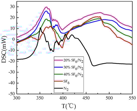 In the DSC curve, the convex peak represents an increase in enthalpy(exothermic) and the concave peak represents a decrease in enthalpy(endotherm). Figure 2 is the DSC curves of epoxy resin decomposed under different experimental gas conditions. As can be seen from Figure 2, the decomposition process of epoxy resin is complicated. Within the main weight loss range of 340 °C–470 °C, there are obvious characteristic peaks of heat absorption and release. The process is divided into three reaction stages: melting, exothermic behavior (solidification, oxidation, reaction, crosslinking), decomposition, and gasification. The peak area of heat absorption indicates the reaction energy level. By integrating the endothermic peak area in the main weight loss interval, the endothermic peak energy is obtained and shown in Table 4. The value arranged from big to small in the following order: 20% SF6/N2 > 30% SF6/N2 > 40% SF6/N2 > SF6 > N2.