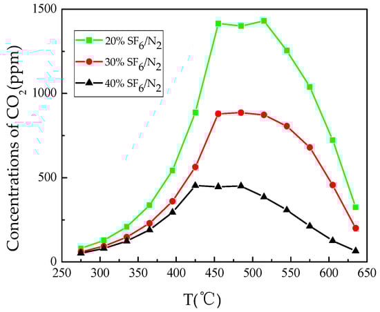 Figure 3 shows the formation of CO2 with temperature. It can be seen that the initial temperature of CO2 formation was always 275 °C under three gas mixtures with different proportions and the rate of CO2 formation increased before 450 °C and the generation rate of CO2 was fastest in the 20% SF6/N2. The formation rate of CO2 tended to become constant during a small temperature range after 450 °C. Finally, the CO2 formation rates of all three gases began to decrease from 515 °C.