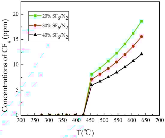 Figure 4 shows the pattern of CF4 generation with temperature. The initial temperature of CF4 formation was 455 °C under three different ratios of gas mixtures, and the formation rate of CF4 increased exponentially with the increase of temperature. The relationship of the initial formation concentration shows in the order: 20% SF6/N2 > 30% SF6/N2 > 40% SF6/N2, that is to say, CF4 has fastest formation rate in the 20% SF6/N2 mixture.