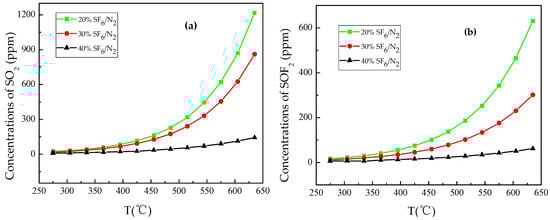 Figure 5 shows the formation of SO2 and SOF2 with temperature respectively. The initial formation temperature of SO2 and SOF2 was 275 °C under three gas mixtures with different ratios. The formation rates of SO2 and SOF2 increased exponentially with the increase of temperature, and the relationship of the initial formation concentration shows in the order: 20% SF6/N2 > 30% SF6/N2 > 40% SF6/N2. With temperature increasing, the formation rate of SO2 was bigger than that of SOF2.