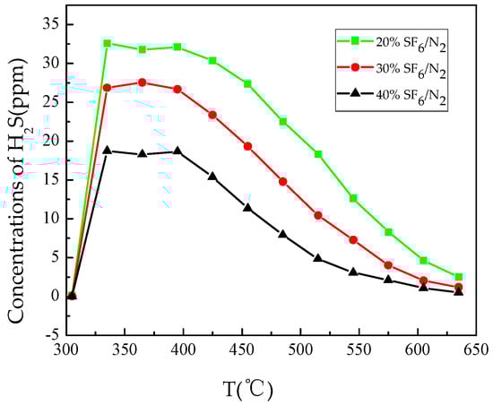 Figure 6 shows the formation of H2S with temperature. The initial formation temperature of H2S in three gas mixtures with different ratios was about 335 °C. The H2S formation rate tended to be constant between 335 °C and 395 °C, and started to decrease above 425 °C. The formation of H2S and CF4 indicates that epoxy resin has entered the stage of rapid decomposition and weight loss. Early detection of this stage can effectively help avoid the serious consequences of further aggravation of overheating fault.
