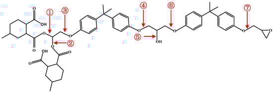As to the intrinsic decomposition mechanism of epoxy resin at high temperature, the simulation analysis was carried out by using ReacFF force field in Materials Studio software to study the formation of small molecular gases such as CO2 and H2O. Firstly, the molecular model of the bisphenol A epoxy resin after curing was constructed as shown in Figure 8. In the figure, ①, ②, ③, ④, ⑤, ⑥, and ⑦ represent C-O bonds at different positions respectively. The unit cell models of 15 epoxy resin molecules were created by using the Construction function in the tool of Amorphous Cell.