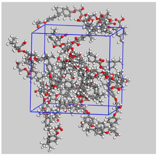 The steps are summarized as follows: Single epoxy resin molecule shown in Figure 8 was constructed, and an initial density of 0.5 g/cm3 was applied. After 300 ps NPT ensemble simulation followed by 1000 ps structural optimization, the final unit cell model with the density of 1.14 g/cm3 was obtained, which is shown in Figure 9. After that, the ReaxFF force field was employed to simulate the decomposition process of the unit cell model at a maximum temperature of 1300 K during local discharge.