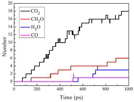 Figure 11 shows the decomposition products of the epoxy resin unit cell model as a function of time. It can be seen that CO2 appears around 70 ps, followed by CH2O, and finally H2O. The concentration of CO2 is higher than that of H2O. CO2 mainly comes from the cleavage of the ester bond connecting the epoxy group, and H2O mainly comes from the elimination reaction of macromolecular ions and the dehydration condensation reaction between molecules.