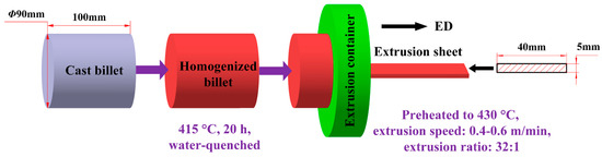 Mg-8Al-0.5Zn (AZ80)-based alloys with different Ce contents were fabricated by melting with the mixture of commercial pure magnesium (99.85%), pure aluminum (99.90%), pure zinc (99.90%), and Mg-28 wt % Ce master alloys. The melting procedure was carried out in an electric resistance furnace under the protection of an inert atmosphere with a mixture of CO2 and SF6 at around 700 °C, and then the melts were poured into a steel die preheated to 200 °C. The dimensions of each cylindrical billet were 94 mm in diameter and 200 mm in length. The chemical compositions of each billet were measured by an optical spectrum analyzer (ARL 4460, Ecublens, Switzerland); each condition has been tested over three times, and for each time, the date result was obtained by measuring the values of 3–4 points on the tested specimens and calculating their average number. The results are presented in Table 1, which shows that the measured compositions were very close to the nominal ones. The cast billets were then machined into cylinders of 90 mm in diameter and 100 mm in length. In order to improve the alloys’ hot deformation performance, a homogenized treatment is necessary to make the non-equilibrium structure of the cast billets uniform in composition by atom diffusion at a high temperature. According to previous experience in our laboratory [16], the billets were homogenized at 415 °C for 20 h, followed by water-quenching. Before extrusion, the billets and the extrusion container were preheated to 430 °C, and then the extrusion was performed at a speed of 0.4–0.6 m/min, and an extrusion ratio of about 32:1. Figure 1 illustrates the schematic diagram of the extrusion process in this work.