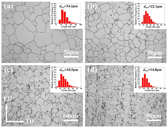 Figure 2a–d shows the OM images of the extruded alloys. These micrographs reveal that the grains of the extruded alloys are all equiaxed grains formed by fully dynamic recrystallization (DRX). Further, the grains of Ce-containing alloys are much finer than those of the alloy with no Ce addition, When the Ce content is gradually added from 0 to 1.4 wt %, the grain size of the as-extruded AZ80 alloy decreases obviously from ~34.2 μm to ~14.8 μm.