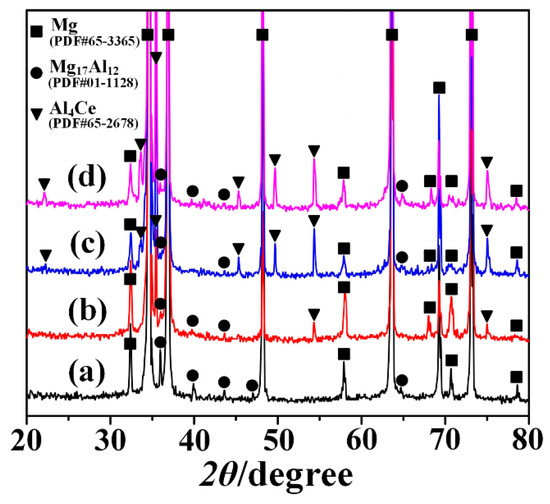 The X-ray diffraction spectra of the as-extruded AZ80-xCe alloys: (a) x = 0; (b) x = 0.2; (c) x = 0.8; (d) x = 1.4.