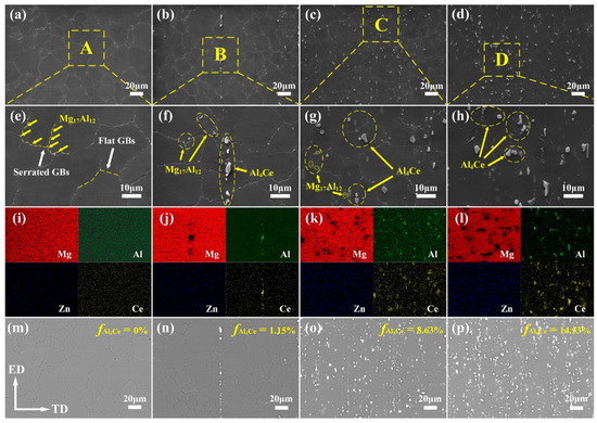 (a–d) Scanning electron microscope (SEM) micrographs of the as-extruded AZ80-xCe alloys: (a) x = 0; (b) x = 0.2; (c) x = 0.8; (d) x = 1.4; (e–h) corresponding magnified SEM diagrams of the selected zone A, B, C, and D in (a–d), respectively; (i–l) corresponding energy dispersive spectrometer (EDS) mapping images of (e–h) (remark: each image contains four parts to show the different elements, Mg, Al, Zn, and Ce are marked in red, green, blue and yellow, respectively); (m–p) corresponding backscattered electron (BSE) micrographs of (a–d) (remark: fAl4Ce indicates the area fraction of Al4Ce phases).