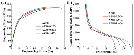 (a) Tensile engineering stress–strain curves of as-extruded alloys; (b) corresponding work-hardening rate Θ vs. the true strain of (a).