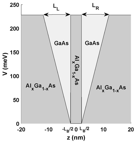 - Simserides, C.D.; Triberis, G.P. A systematic study of electronic states in n-AlxGa1−xAs/GaAs/ n-AlxGa1−xAs selectively doped double-heterojunction structures. J. Phys. Condens. Mater. 1993, 5, 6437–6446. [Google Scholar] [CrossRef]