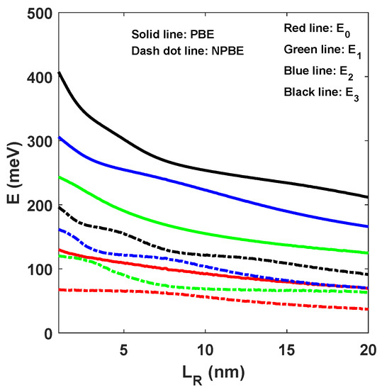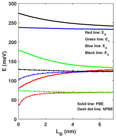 The energy levels are depicted in Figure 5 corresponding to the AlGaAs barrier width , which is varied from 0 nm to 7 nm. We keep the width of left-hand well nm and the width of left-hand well nm, and focus on the dependence of these levels on the barrier width . Also, the influence of NPBE on these levels has been taken into account. When the barrier width , the double semi-V shaped QWs becomes an individual single V shaped QW. The ground state energy level slowly increases by increasing barrier width , which gradually tends to a fixed value when the barrier width . The first excited state energy level and the third excited state energy level gradually decreases as the barrier width increases. The second excited state energy level almost keep constant with increasing barrier width . The energy levels , , and and the ground state have similar changes, which gradually tends to a fixed value when the barrier width . This is because the thick barrier decreases the tunneling between two QWs and makes the coupling QWs behave like an individual single QW with no coupling to the adjacent well [37]. More important, we can observe that these energy levels with considering the influence of the NPBE are significantly reduced compared with the case without considering the influence of the NPBE. Simultaneously, it is obvious that these energy levels have been significantly corrected by the NPBE. The ground state and the second excited state energy levels slowly increases by increasing barrier width , which gradually tends to a fixed value when the barrier width . The first excited state and the third excited state energy levels almost keep constant with increasing barrier width .