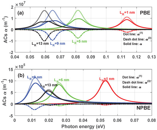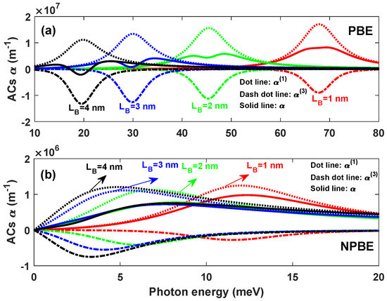 Figure 3 illustrates the linear , the third-order nonlinear , and the total OACs as a function of the photon energy , with nm and nm. Several distinct values of the width of right-hand well have been taken into account with and without considering the influence of NPBE, which are illustrated in Figure 3a,b, respectively. From these figures, it can be clearly seen that the , and as a function of photon energy have an prominent peak with a common location, which occurs at due to the one-photon resonance enhancement. As seen in Figure 3a, As the width of right-hand well increases, the resonant peaks shift to the aspect of low energy. This is due to the energy difference between the ground state and first excited state decreases when the width of right-hand well increases (see Figure 2). Moreover, we can see that the total OACs will be significantly split into two peaks with the increase of the width of right-hand well , which shows the light transparent effect. The wider the width of right-hand well is, the more obvious the effect is. That is because when the width of right-hand well reaches a certain width, the magnitude of the resonant peaks of the third-order OACs increases slightly, and the magnitude of the resonant peaks of the linear OACs is almost unchange. Moreover, the total absorption coefficient is increased by the linear term, but it is significantly reduced by the third-order nonlinear term. Therefore, the cusp shape in the total OACs curves also becomes more prominent with increasing the width of right-hand well (see Figure 3a). From Figure 3b, it can be clearly seen that the magnitude of the resonant peaks of the total OACs decreases significantly when considering the influence of NPBE. The reason is the correction of NPBE on the wave functions of the electron or the matrix element dominated the magnitude of the resonant peaks of OACs (see Equations (10) and (11)). In addition, the resonant peaks suffer an obvious red-shift with the increase of the width of right-hand well when considering the influence of NPBE except for the width of right-hand well nm. These results originate from the correction of NPBE on the electron energies. It is obvious that the energy levels are close to each other and the energy levels spacing is reduced when considering the influence of NPBE(see Figure 2). Furthermore, when considering the influence of NPBE, the saturation will disappear on the total OACs , and the magnitude of the resonant peaks of the total OACs appears a minimum value when the left-hand well and the right-hand well are symmetry.