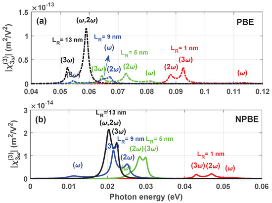 Variations of the THG coefficients versus the photon frequency with nm, for two case: Without (a) and with (b) considering the influence of NPBE.