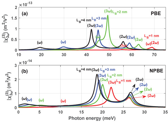 In Figure 7, we discuss the THG coefficients as a function of the photon energy without (Figure 7a) and with (Figure 7b) considering the influence of the NPBE for nm. It is seen from the Figure 7a that the resonant peaks will move to the left of the curve when the barrier width increases. This phenomenon is attributed to the decreasing of the energy interval , and with increasing barrier width . All these phenomena agree well with above results discussed in Figure 5. The magnitude of the resonant peaks of the THG coefficients reaches maximum when barrier width nm. This is because the superposition between the spectra can enhance the THG . In other words, both of the one photon resonance and the three photon resonance happen in the same place . We can find some obvious differences compared with the case with considering the influence of the NPBE (Figure 7b). The resonant peaks of the THG coefficients appear at lower energies, which is due to the correction of the NPBE, and the magnitude of the resonant peaks of the THG coefficients is reduced.