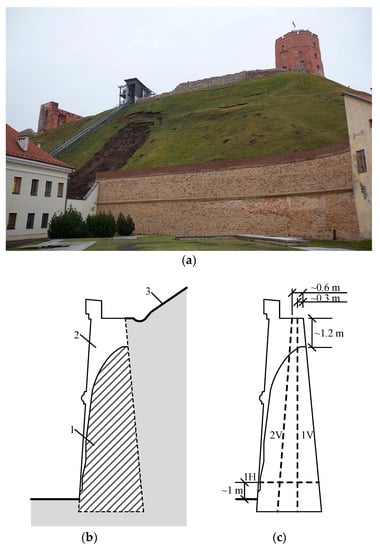 The retaining wall of the Gediminas Castle Hill is a gravity wall of variable thickness. The length of the wall leaning into the hill is approximately 42 m. The thickness of the wall is 3.2 m at the bottom and 2.8 m at the top. The height of the wall including the parapet is approximately 9 m []. The section drawing of the retaining wall is presented in Figure 1 []. The retaining wall was restored in 1962 according to the design of architect Sigitas Lasavickas [].