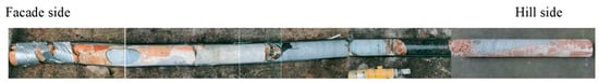 Two vertical boreholes (1V and 2V) were drilled approximately 9 m deep along the entire height of the wall (pictures of the core samples are illustrated in Figure 2) and one horizontal borehole (1H) was drilled along the entire width of the wall (Figure 3).