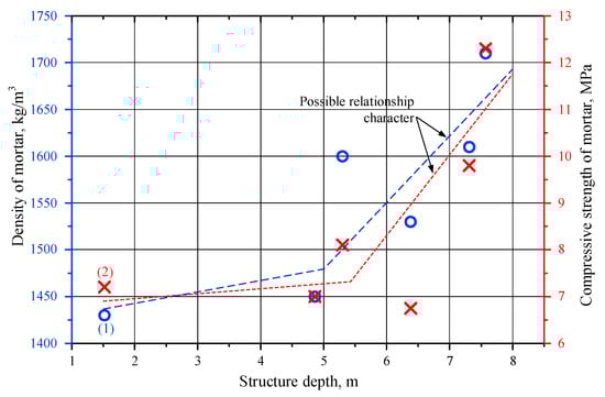 Relationship between mortar density and structure depth (1), and compressive strength and structure depth (2).
