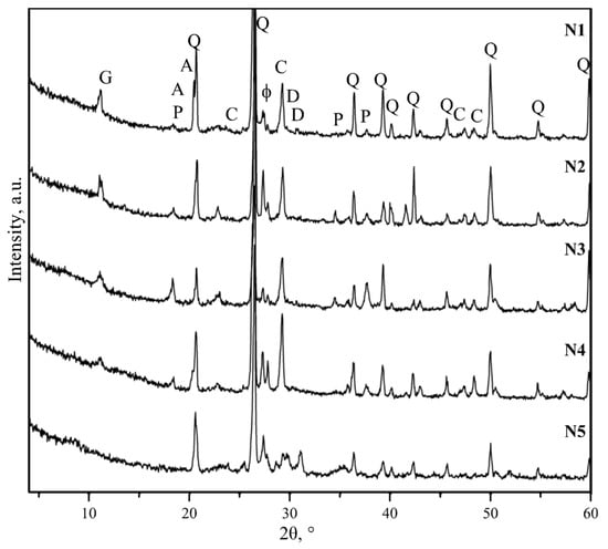 Diffraction curves of tested specimens (N1–N5): C—calcite, Q—quartz, ɸ—feldspar, G—gypsum, P—portlandite, A—gibbsite, and D—dolomite.