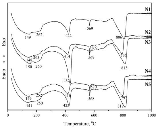 Figure 8 illustrates the differential thermal analysis (DTA) curves of the mortar specimens. The weight loss values in different temperature ranges obtained from the thermogravimetric (TG) curves are presented in Table 5. All tested specimens produced five endothermic peaks in the 140–150, 250–263, 410–430, 568–570, and 790–820 °C temperature ranges (Figure 8).