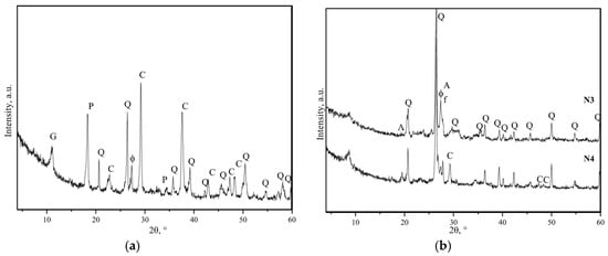 Diffraction curves of aggregates in the mortar: (a) white inclusions and (b) ceramic brick crumbles: C—calcite, Q—quartz, ɸ—feldspar, G—gypsum, P—portlandite, A—gibbsite, and D—dolomite.