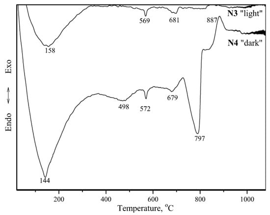 The DTA curves of the tested specimens (Figure 11) revealed five endothermic peaks (at approximately 140, 500, 570, 680 and 800 °C) and one exothermic peak at 887 °C for the dark-coloured ceramic brick crumbles, specimen N4, and only three endothermic peaks at approximately 160, 570, and 680 °C for the light-coloured brick crumbles, specimen N3. The endothermic peak at 800 °C in the DTA curve of specimen N4 could be attributed to the calcite decomposition, which was also identified by X-ray tests (Figure 10b). This mineral was not identified in the light-coloured brick crumbles used as mortar aggregates. Thus, the light-coloured ceramic was fired at high temperatures (the calcite present in the clay disintegrated), while the dark-coloured ceramic was apparently fired at temperatures below 800 °C (calcite was still present). Studies on the clay extracted from Lithuanian quarries [] indicated that the local clay fired at 600 °C presented pozzolanic properties.
