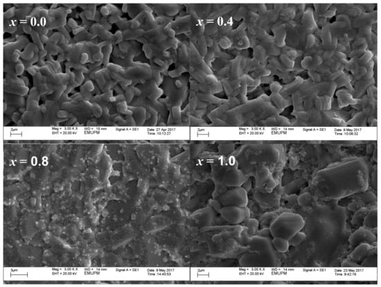 The SEM images in Figure 2 and Figure 3 reveal the morphologies of both the surface and cross-section of the bulk samples, respectively, at (3000×) magnification. Figure 2 shows a granular grain growth for pure Y-123 ceramics with an average grain size of 1.6 μm. It is apparent that both Figure 2 and Figure 3 show an enhancement of grain size and compactness structures as the SnO2 addition increases. The grains also seem to elongate more at one side, forming a rectangular-like structure. The average grain size was measured using 133 to 152 selected grains by considering both dimension of the grains, as illustrated in Figure 4, and the results obtained were 1.6 μm, 1.8 μm, 4.6 μm and 4.9 μm for x = 0.0, 0.4, 0.8 and 1.0, respectively. From the EDX elemental mapping, Sn ion precipitates started to appear at x = 0.8 and tended to agglomerate at the grain boundaries on the surface of the sample. The elemental compositional ratios for all samples are also relatively close to the 1:2:3 ratio of YBa2Cu3O7−δ. The EDX mapping of Sn ions on the surface and cross-section of x = 1.0 is illustrated in Figure 5. The Sn ion mapping, represented by red dots on the surface of the x = 1.0 sample, further confirms the agglomeration of Sn-based phases at the grain boundaries, while the Sn ion mapping on the cross-section reveals the presence of randomly scattered Sn across the cross-section.