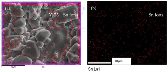 (a) SEM image of the surface of Y-123 at x = 1.0 together with EDX mapping Sn ions (red dots) and (b) EDX mapping of Sn ions without Y-123 matrix.