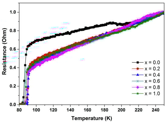 Figure 6 shows the electrical resistance measurement on all samples exhibiting metallic behaviour in the normal state. The first drop of resistance in the superconducting transition was labelled as Tc-onset, and the temperature at which resistance starts to zero is the Tc-offset. The critical temperature Tc-onset was attained at 90, 92, 91, 89, 90 and 90 K, while the Tc-offset was 83, 88, 88, 85, 86 and 86 K for samples x = 0.0, 0.2, 0.4, 0.6, 0.8 and 1.0, respectively. From Table 2, it is figured that there is not much change in the Tc-onset and Tc-offset of the sample. However, superconducting transition width, (∆Tc = Tc-onset − Tc-offset), listed in Table 2 decreased upon the addition of SnO2, implying that the grains’ connectivity had been improved []. This may be attributed from a more homogeneous oxygenation of grains in the sample achieved by the addition of SnO2 in Y-123 sample []. SnO2 nanoparticles were previously added at one concentration (x = 0.2 wt.%) into Y-123 synthesized using the solid-state reaction method []. By comparing our results with those obtained by Salama et al., it can be noted that the Tc-onset, Tc-offset and ∆T in of the pure sample in their work are better than those in the current work. However, the superconducting properties of the SnO2 added to the thermal treatment-synthesized Y-123 at x = 0.2, i.e., this work, were improved, and were even better than those reported in [], see Table 2.