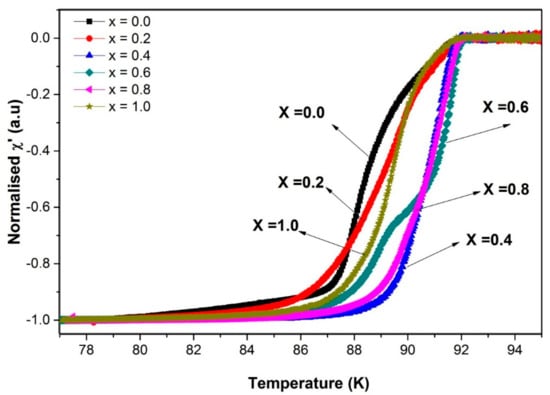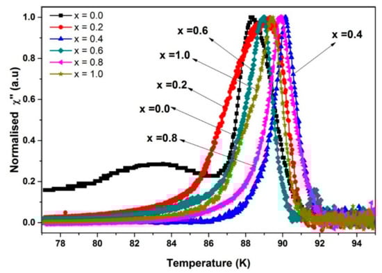 The normalised AC susceptibility for both real χ′ and imaginary χ″ parts are presented in Figure 7 and Figure 8, respectively. The information regarding the diamagnetic transition of bulk superconductor can be obtained from the real part χ′ []. Double step transition in this part is due to the weak link behaviour of the superconducting sample []. It is noted that the first drop at higher temperature, Tc-onset, is related to intragranular shielding, while the second drop at a lower temperature, Tcj, is related to intergranular shielding []. In Figure 7, sample x = 0.0 exhibited the double step behaviour, which was improved with the addition of SnO2. At x = 0.4, the transition became steeper, indicating reduced weak links and a stronger interconnectivity between the grains. However, the transition starts to broaden at x = 0.8 and x = 1.0, suggesting that x = 0.4 is the optimum weight percentage for SnO2 addition. This broadened curve is caused by the magnetic flux penetrating the sample surface when there is a decrease in the screening current required to exclude the flux []. From Tc-onset and the phase-lock in the temperature, Tcj, tabulated in Table 3, maximum Josephson current, I0, can be estimated using the Ambegaokar-Baratoff theory in the following equation [],