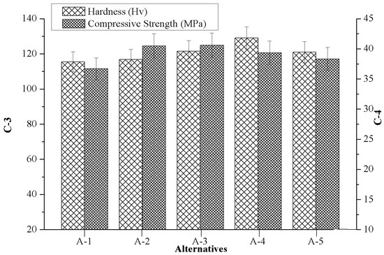 Figure 4 depicts the effects of marble dust reinforcement in respect to criterion-3 (hardness) and criterion-4 (compressive strength) for the manufactured composites. As shown in Figure 4, when it is introduced in the composition of a composite with a higher marble content from 0 wt.% to 4.5 wt.%, the hardness of composites significantly improved from 115.49 Hv to a maximum of 128.97 Hv. Hereby, any further marble content introduced promoted a reduction in the hardness of composites up to 120.94 Hv (i.e., A-5). An improvement in the value of the microhardness of marble particulate C93200 alloy composites endorsed a better bonding strength achieved at the base alloy with a reinforcement interface. From Figure 4 we note that the compressive strength of the composite increased proportionally with the amount of marble content added and the maximum value of compressive strength was indentified within the composite that contained 3 wt.% of marble reinforcement (A-3). However, on further addition of marble particulate, the compressive strength of the composite gradually decreased. At a higher weight percentage of reinforcement, there is much possibility of segregation of reinforcement and less contact surface area between the matrix alloy and the reinforcement which resulted in a subsidence of hardness and compressive strength [31]. The other two reasons that may also be responsible for the decrement in the compressive strength of the composite, was caused by adding in different marble content: First, the effect of residual stress during the deformation process, and second, the failure of clustered submicron marble particles and presence of porosity and oxide layers during the casting process [32].