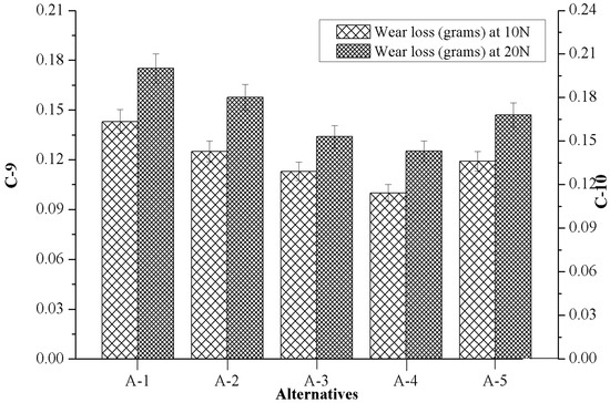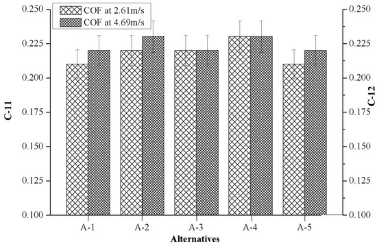 The effects of marble dust reinforcement on criterion-11 (COF 2.61 m/s, 15 N) and criterion-12 (COF 4.69 m/s, 15 N) of composites are depicted in Figure 8. It can be appreciated that the value of COF (µ) varies in a very narrow range (0.21 ≤ µ ≤ 023) among all the values of alternatives. Further, when the weight percentage of marble reinforcement was increased, a higher friction coefficient was noted. This later circumstance occurred during the addition of hard marble particulates which enhanced the abrasive elements in the present investigated composites. The maximum value (i.e., 0.23) of COF was observed in A-4 for both the test conditions. It was also found that slightly higher COF was observed at higher sliding velocity (4.69 m/s) as compared to COF at lower sliding velocity (2.61 m/s).