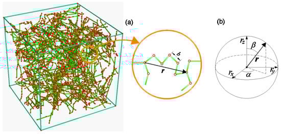(a) Scheme of the polymeric chains network. (b) Definition of the end-to-end vector for a single chain in the configuration space .