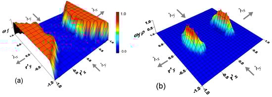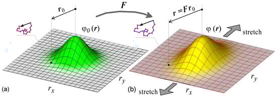 2-D scheme of the end-to-end distribution function in the undeformed state (a) and in the deformed one (b). The evolution, due to the deformation, from to a generic obeys Equation (7).