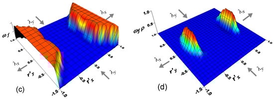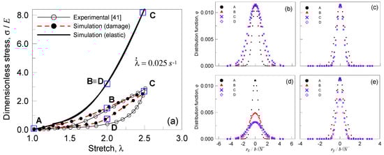 Further, the cross-section of the distribution function related to the first network (, the one present with the greatest volume fraction ) along the (Figure 9b,d) and (Figure 9c,e) axis evaluated at various steps of the deformation history has been determined. The deformation states corresponding to the points indicated with A, B, C, and D in Figure 9a have been considered for the elastic as well as for the damage response; it can be appreciated that such a distribution widens in the direction of the applied deformation (Figure 9b,d) and narrows in the normal direction. It can be noticed that the occurrence of the damage is reflected in the decreasing of the area under the distribution function (Figure 9d) due to the chains loss. On the other hand, the chains oriented in the direction normal to the applied stretch do not fail easily, as witnessed by the distribution function’s sections along the axis; the sections’ pattern related to the elastic response (Figure 9c) is very similar to that related to the behavior in presence of damage (Figure 9e).