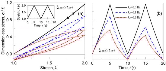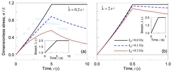 In the second parametric test, the material is stretched to a given value, and then the deformation is kept constant (see details in Figure 6); the applied deformation is quantified through the parameter , being with . It can be observed that the material behaves perfectly linearly when no chains detachment occurs (); meanwhile, by increasing the detachment frequency, the stress reached in the material for a given stretch decreases (Figure 6). Moreover, by keeping the deformation constant, the material relaxes itself more significantly for higher values; finally, the elastic case is recovered in the particular case .